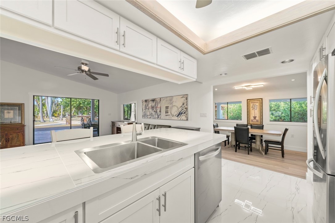 Welcome to your own slice of paradise on Sanibel. This cozy island-style home is perfectly situated mid-island in a desirable location close to world class beaches and easy access to the Sanibel Causeway while being tucked away in peaceful privacy. Step inside and fall in love with the vaulted ceilings and architecturally pleasing open floor plan designed for relaxed island living. The completely remodeled home has a spacious master suite that immerses you in the natural environment, an updated kitchen with modern LG appliances and a guest suite with private living area that provides personal space for guests. Outside, enjoy expansive decks perfect for entertaining, barbequing or sunset gatherings. Situated on a quiet dead end road, this home offers a truly unique and private setting, your own tranquil retreat. Central location offers opportunities to ride your bike or golf cart to the beaches, restaurants, shops and grocery store-everything you need! Additionally, multiple garages provide plenty of room for all your toys. There is also an additional 0.47 acres building site available. This is more than a home, ITS A LIFESTYLE! Take a look, you won't be disappointed.